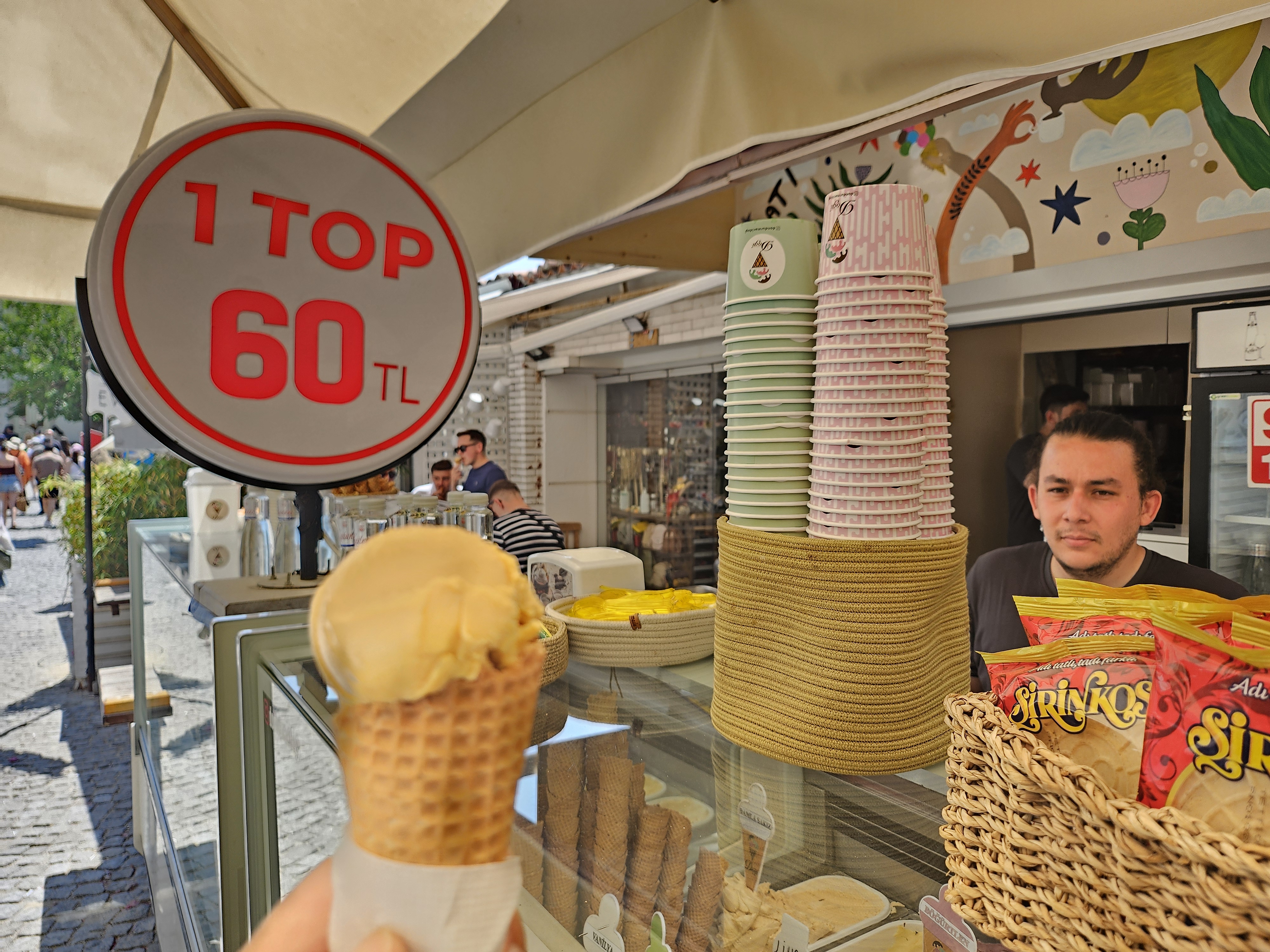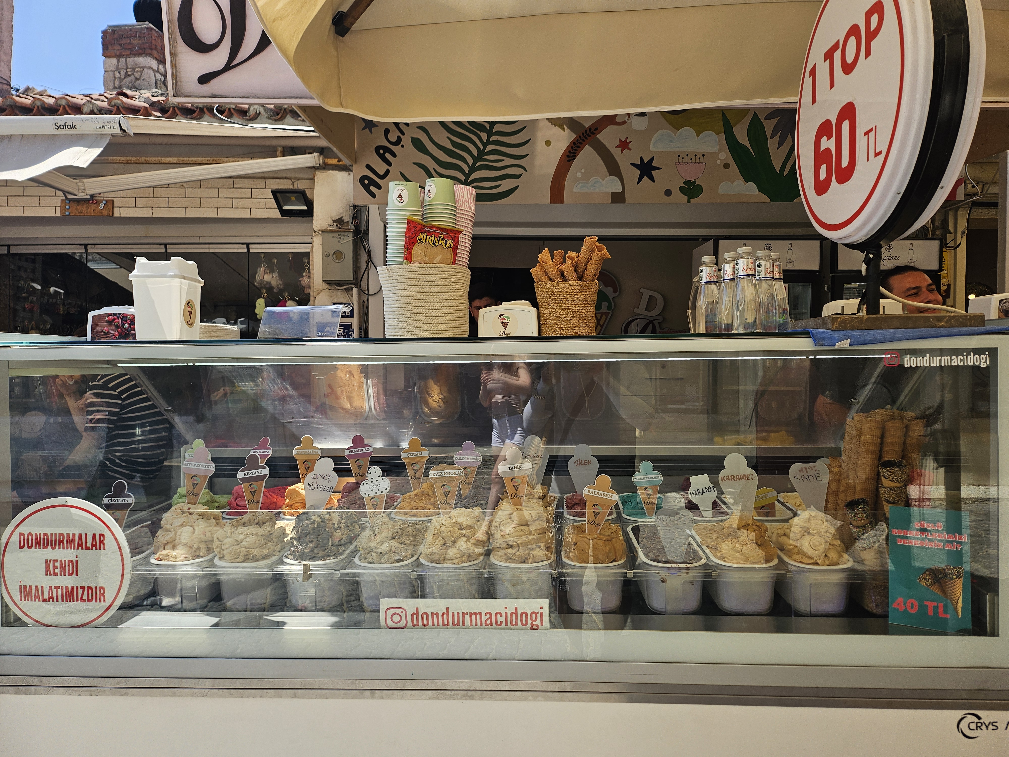 번화가 골목쯤에 다다르자 많은 사람들이 보였습니다. 앉아서 쉬는 사람, 아침 식사를 하는 사람, 우리와 같이 관광을 하며 골목 구석구석을 즐기는 사람들로 인산인해였습니다. 마친 골목 한편에는 아이스크림(젤라또, 튀르키예말로는 돈두루마)이 있어 한입 먹어보고 가기로 했습니다. 한국에서도 젤라또를 만나 볼 수 있지만 현지에서의 느낌은 어떨지 몰라 지갑을 열어 현금을 전하고 아이스크림을 받아 봅니다. 아이스크림 자체가 쫀득쫀득 하니 혀에 느껴지는 감촉이 너무 부드럽고 시원함을 느끼게 해 줍니다. 60리라니 꼭! 먹어보세요.