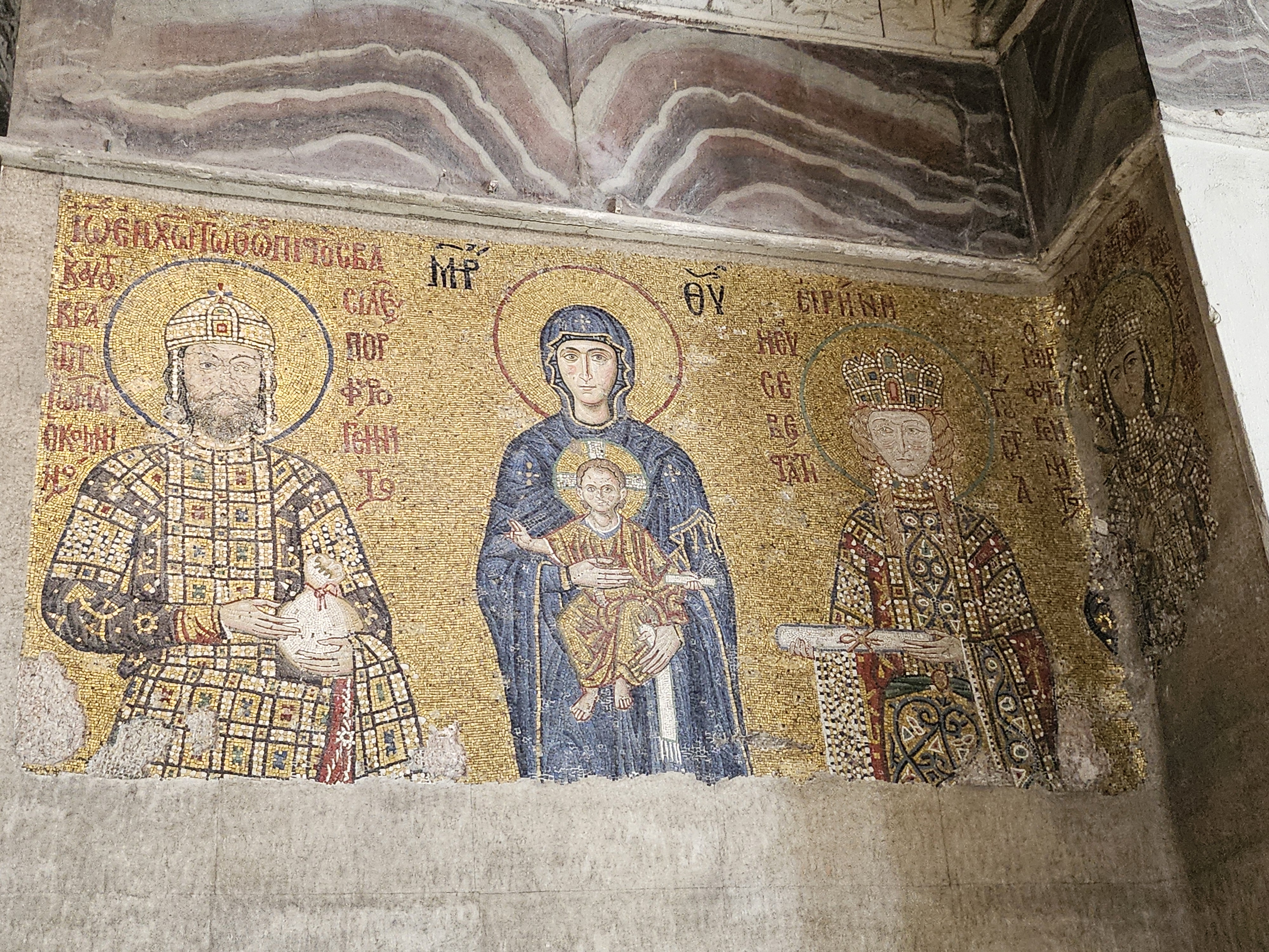 아야 소피아는 초기 성당으로 건축되어 각 공간에 기독교적인 회화 작품이 많이 있었다고 합니다. 하지만 이슬람의 침공과 시간의 흐름에 따라 현재는 남아 있거나 보존되어 있는 것은 일부분이었습니다. 특히 이슬람 모스크로 변모하는 과정에 기독교 성화 모자이크 위에 회칠을 덧씌우고 이것들이 떨어지게 되며 많은 부분이 소실되어 현재에 이르게 되었다고 합니다.