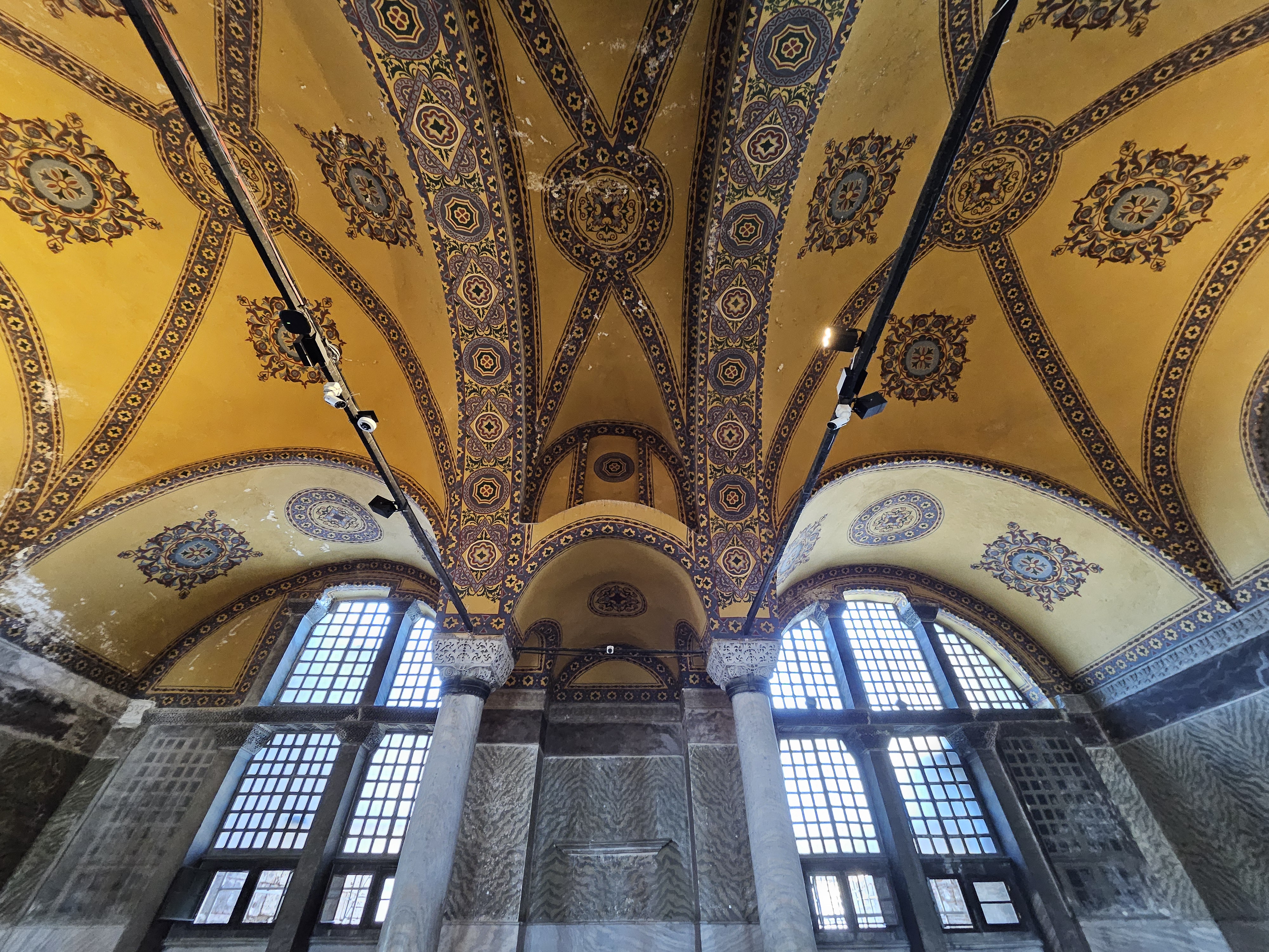 이스탄불 여행 관련 글을 찾다 보면 가격 대비 보잘것이 많이 없다는 평가가 많이 있어 이니스도 잠시 고민을 하였지만 과거 성당으로 시작해 현재는 모스크로 그 역사적인 의미와 시대의 흐름을 알고 싶어 기꺼이 비용을 지불하고 방문을 하였습니다. 겉에서 보는 초라함 모습과는 달리 2층에서 바라본 아야 소피아는 당시의 기술력으로 어떻게 이런 건축물을 설계하고 지을 수 있는 그 첫 번째에 대한 물음과 놀라움이 있었고, 두 번째로 천정과 벽면 모두에 다양한 회화 작품을 그려 넣어 하나의 예술작품을 완성해서 현재까지 이르렀다는 사실에 무척 놀랐습니다. 비록 2층이라는 공간 밖에 볼 수 없다는 아쉬움이 있었지만 1층부터 볼 수 있었다면 더 많은 것을 보고 느끼고 두 눈에, 머리에 더 남기고 올 수 있지 않았을까 하는 아쉬움이 컸던 방문이었습니다.