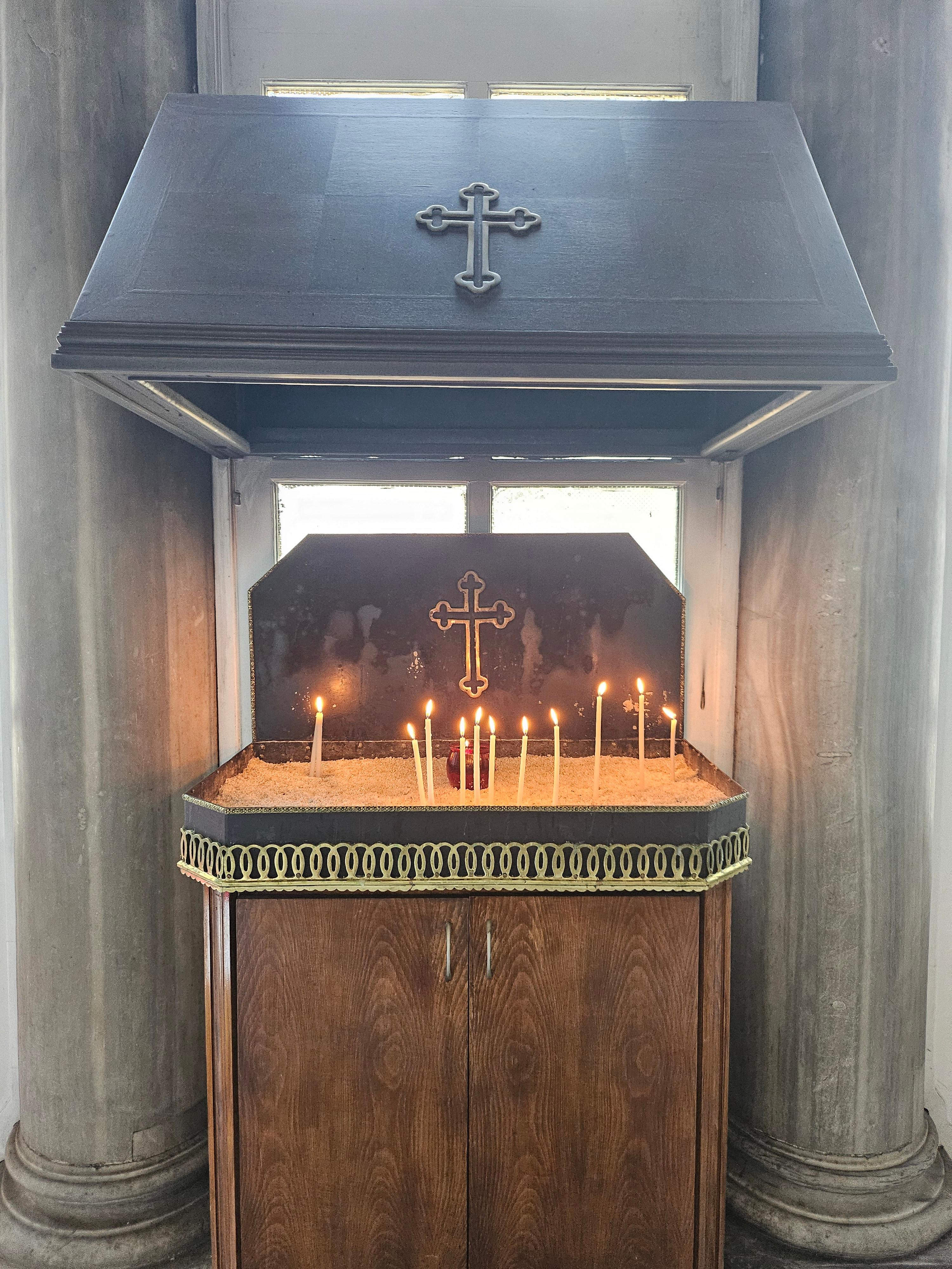 성당 입구를 열고 들어가면 이곳을 관리하는 사람이 머무는 장소와 더불어 초를 켜고 간단한 기도를 드릴 수 있는 공간이 있었습니다. 기도자가 원하는 만큼의 비용을 지불하고 초를 하나 사서 아래와 같이 십자가 앞에 불을 붙이고 기도를 할 수 있었습니다. 이니스도 가지고 있는 리라를 모금함에 넣고 불을 켠 뒤 가족의 행복과 안전한 해외출장이 될 수 있도록 기도를 드리고 다음 장소로 이동을 하였습니다.