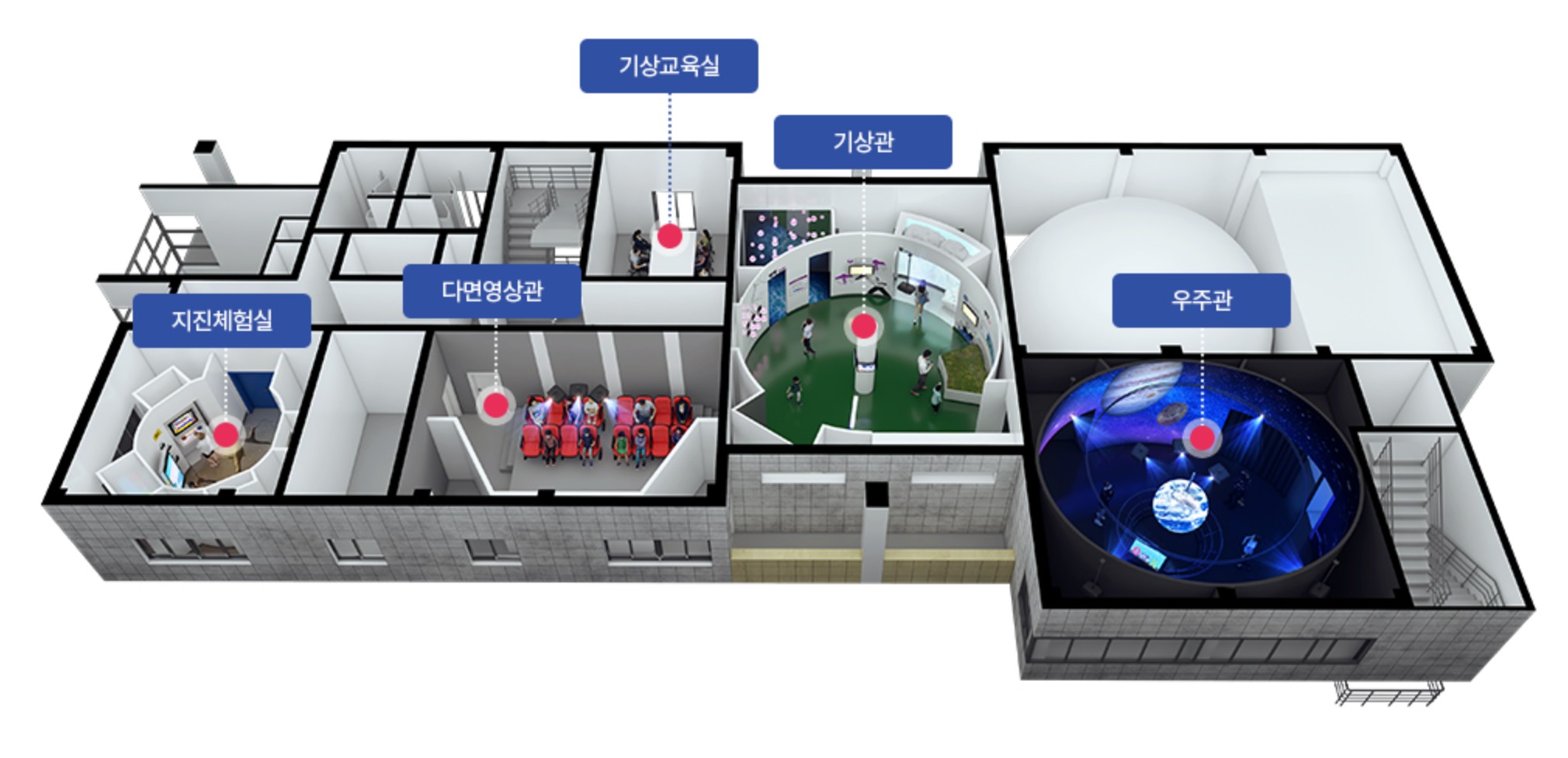 - 우주관: 구형의 지구모형 스크린을 통해 기상현상, 기후변화, 태양계 행성 등을 볼 수 있고, 천리안 기상위성에 대해 배울 수 있어요.