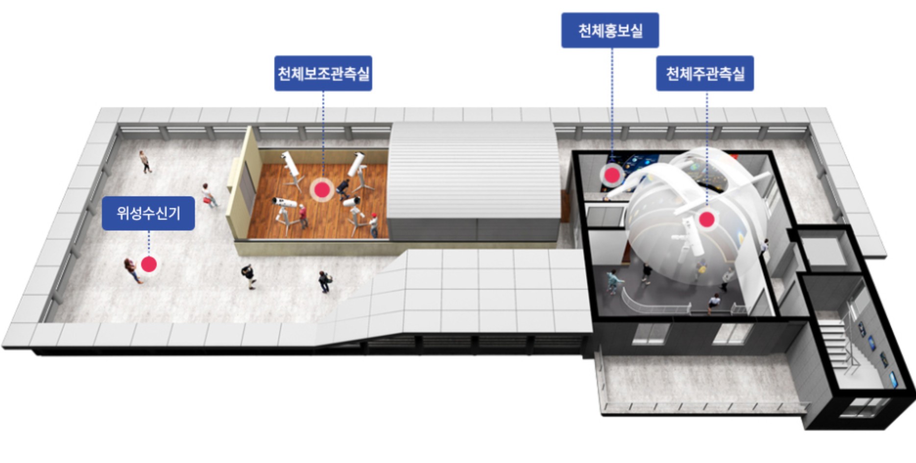 • 천체보조 관측실: 슬리이딩 돔을 활용해 밤하늘의 별자리 및 반사/굴절 망원경의 원리를 배울수 있어요.