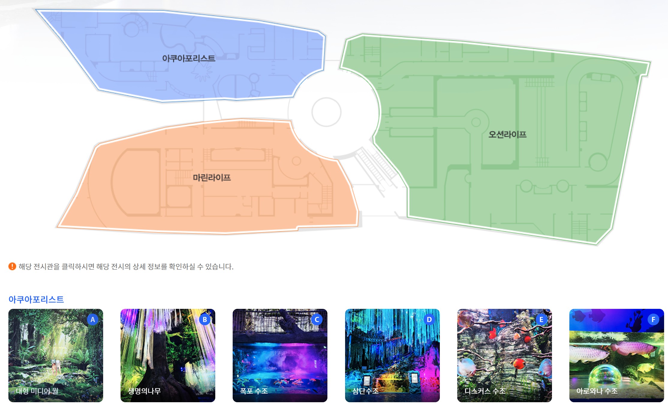 • 🎮 메인 수조: 대형 수조안의 다양한 바다생물을 만나볼 수 있는 공간입니다.
